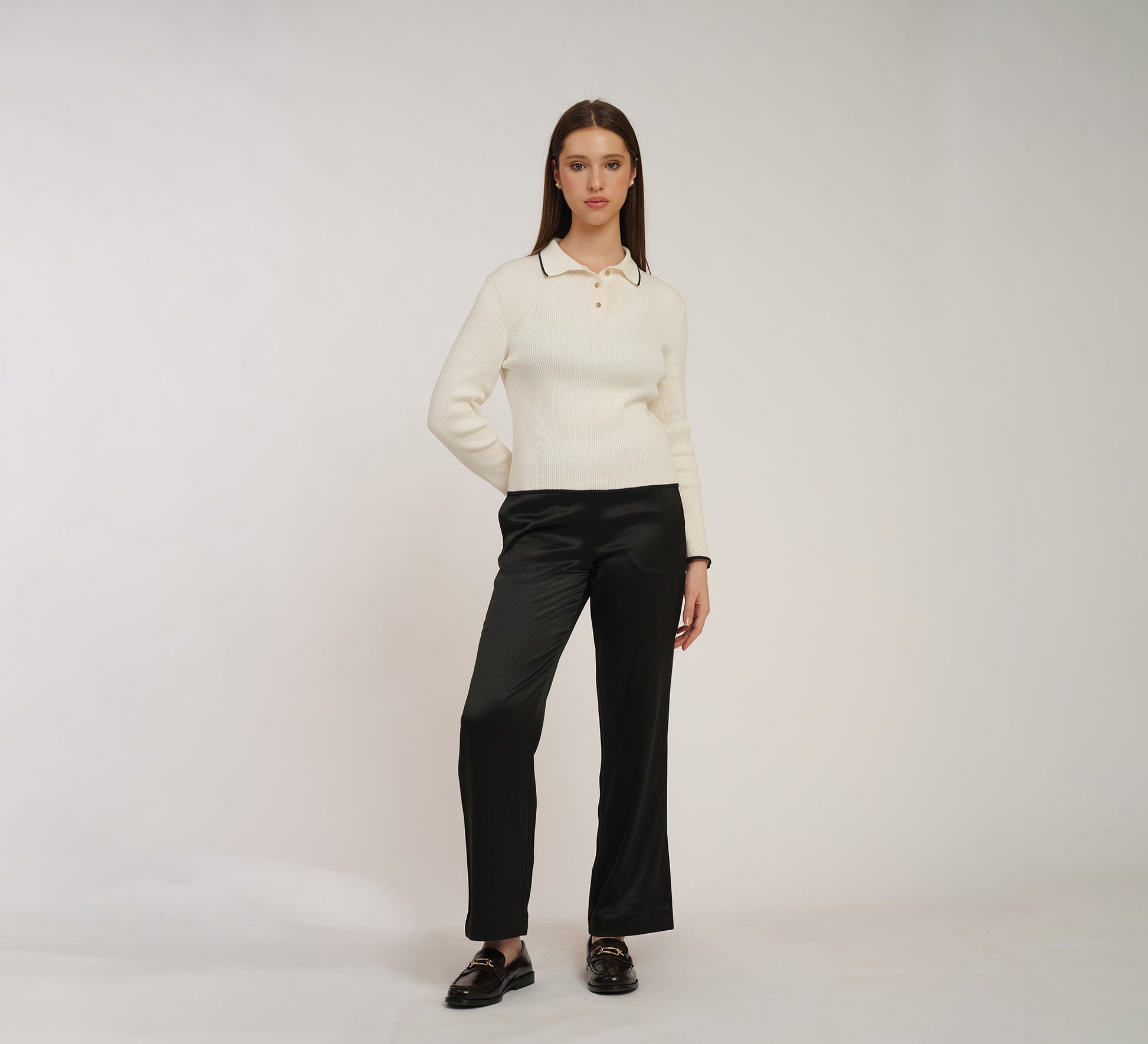 Elegant black silk trousers offering a luxurious drape and natural sheen. Regular fit with a high-rise waist and relaxed leg for timeless elegance.