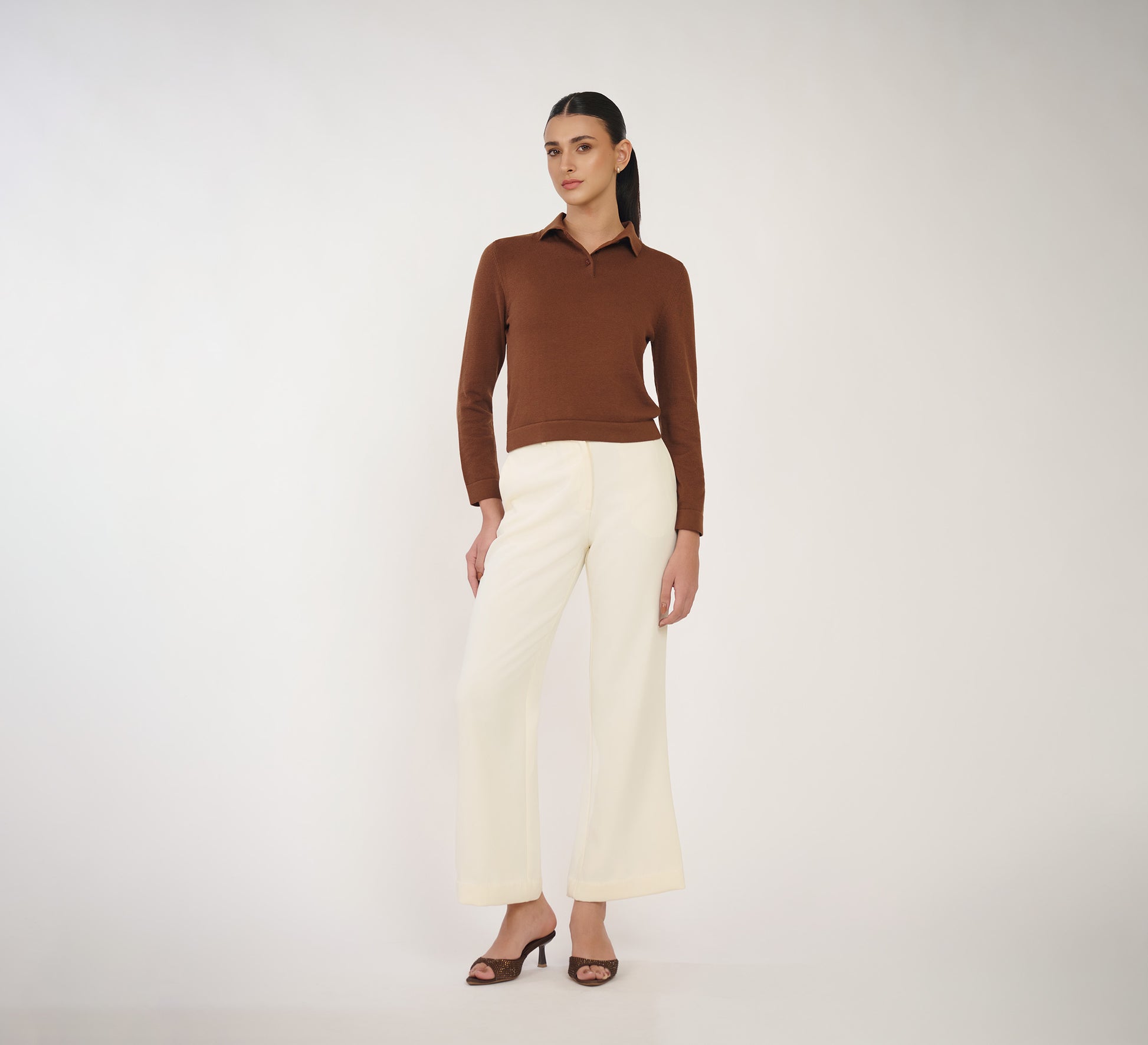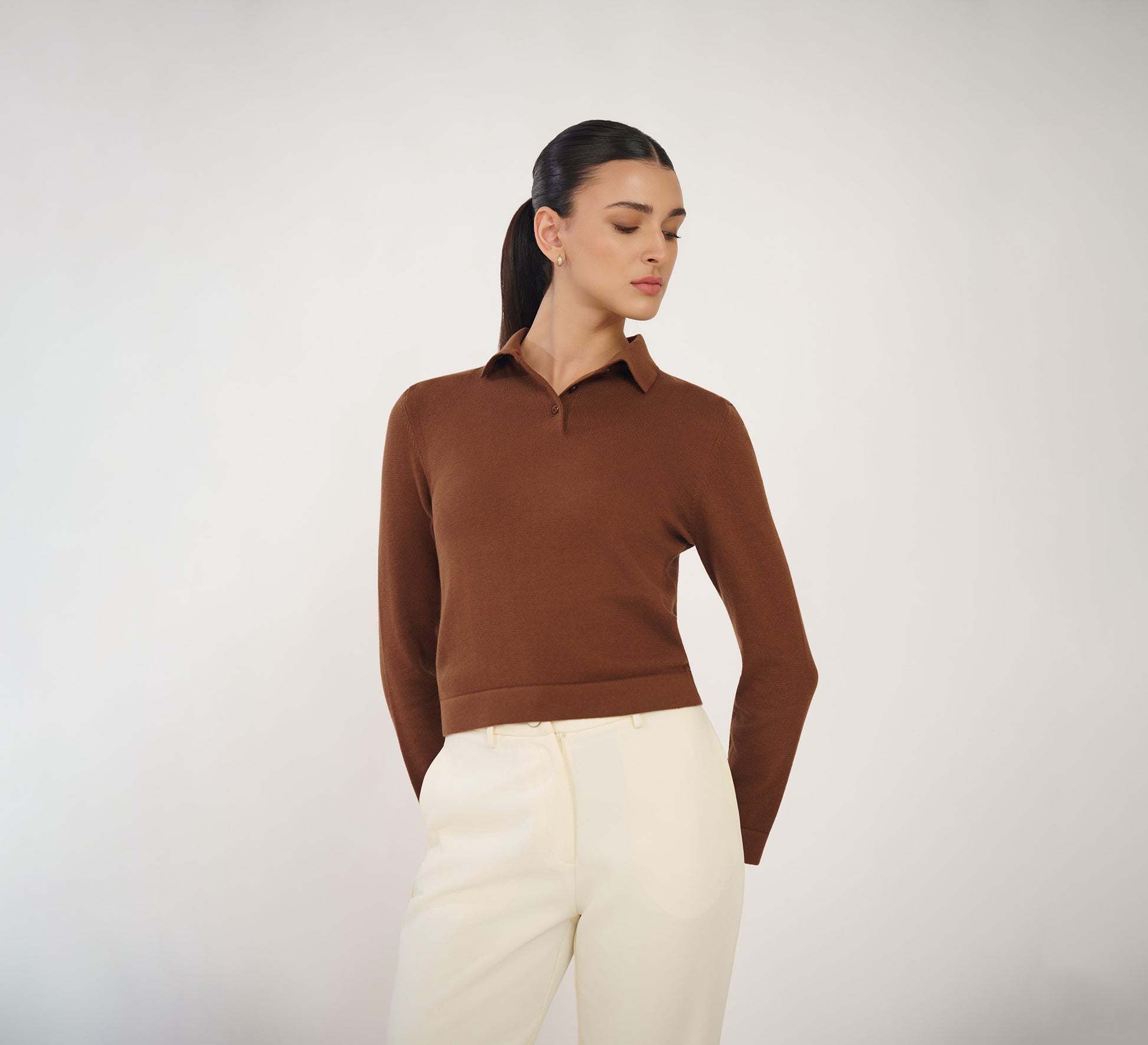 Crafted from a fine knit, this brown polo offers a structured yet comfortable silhouette. Regular fit with subtle knit texture. Elegant and versatile for both day and evening looks.