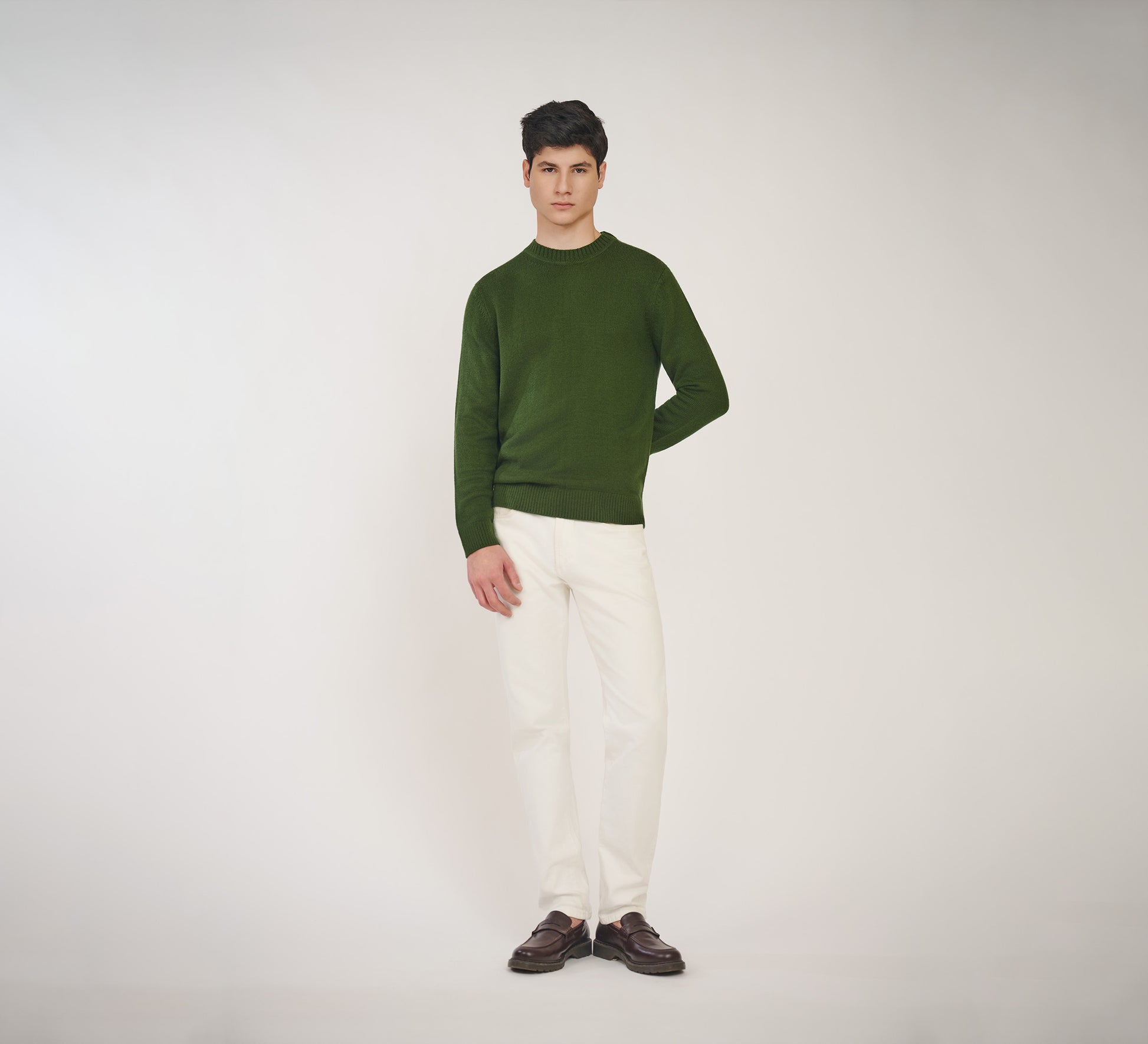 A soft knit sweater in green, crafted for warmth and texture. Regular fit with a clean neckline and ribbed detailing on the sleeves and hem.
