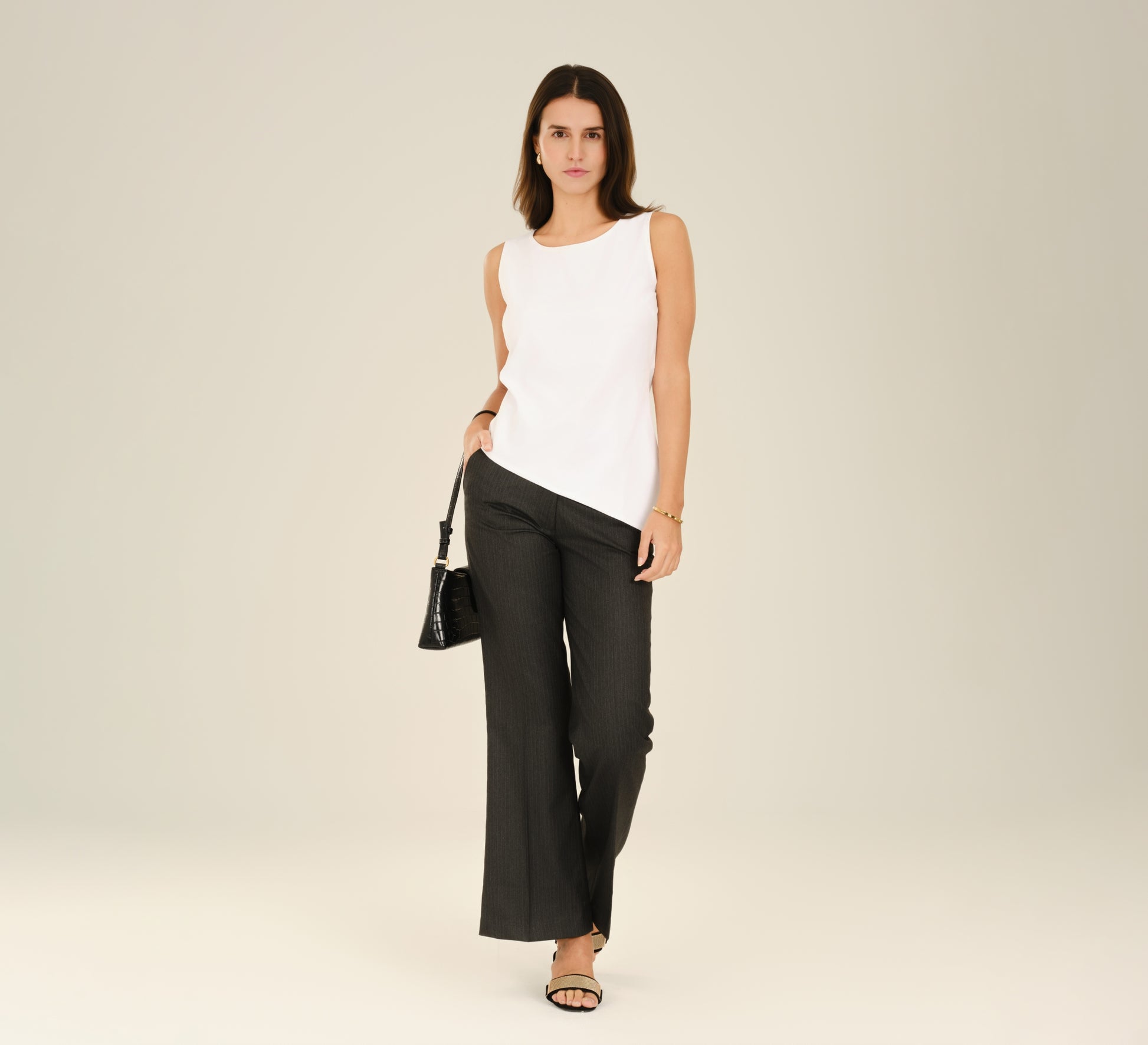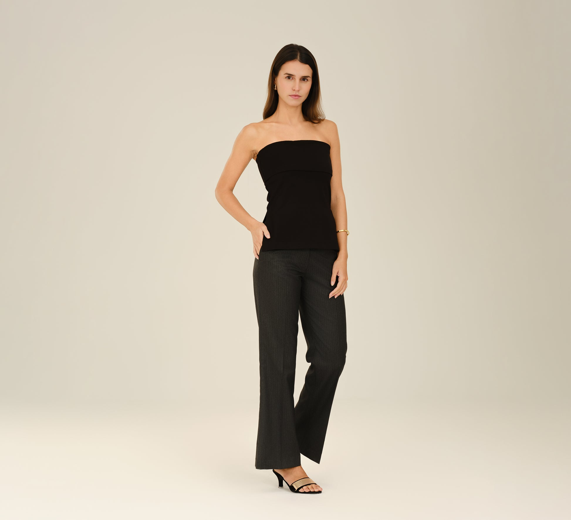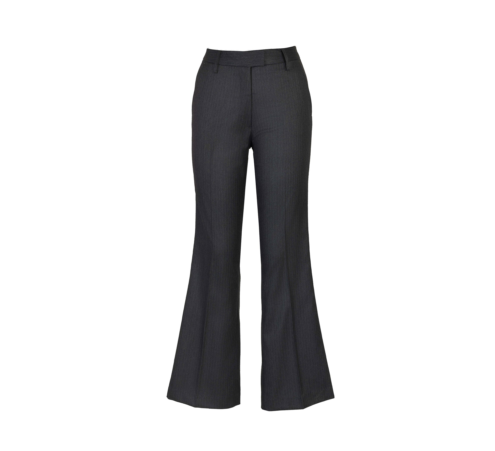 Tailored grey pinstripe trousers crafted from a premium wool-viscose-polyester blend, offering a refined drape and a subtle sheen. Designed with a structured waist for a perfect fit, they flare at the bottom for an elegant, elongating silhouette.