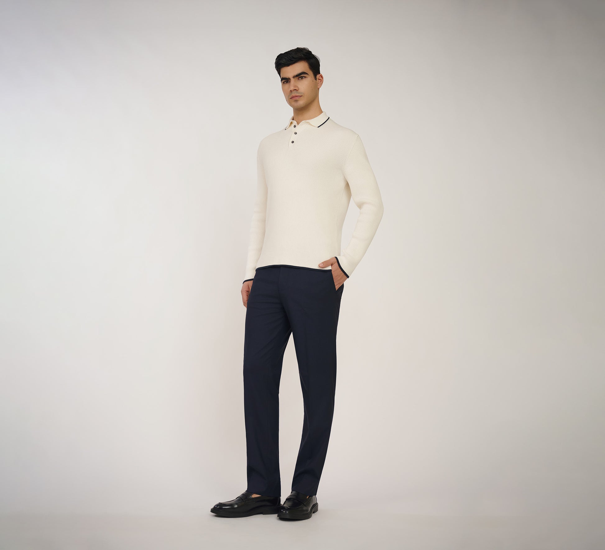 A refined ribbed polo with navy trims on collar, sleeves, and hem. Regular fit offering classic comfort and versatility for everyday elegance.