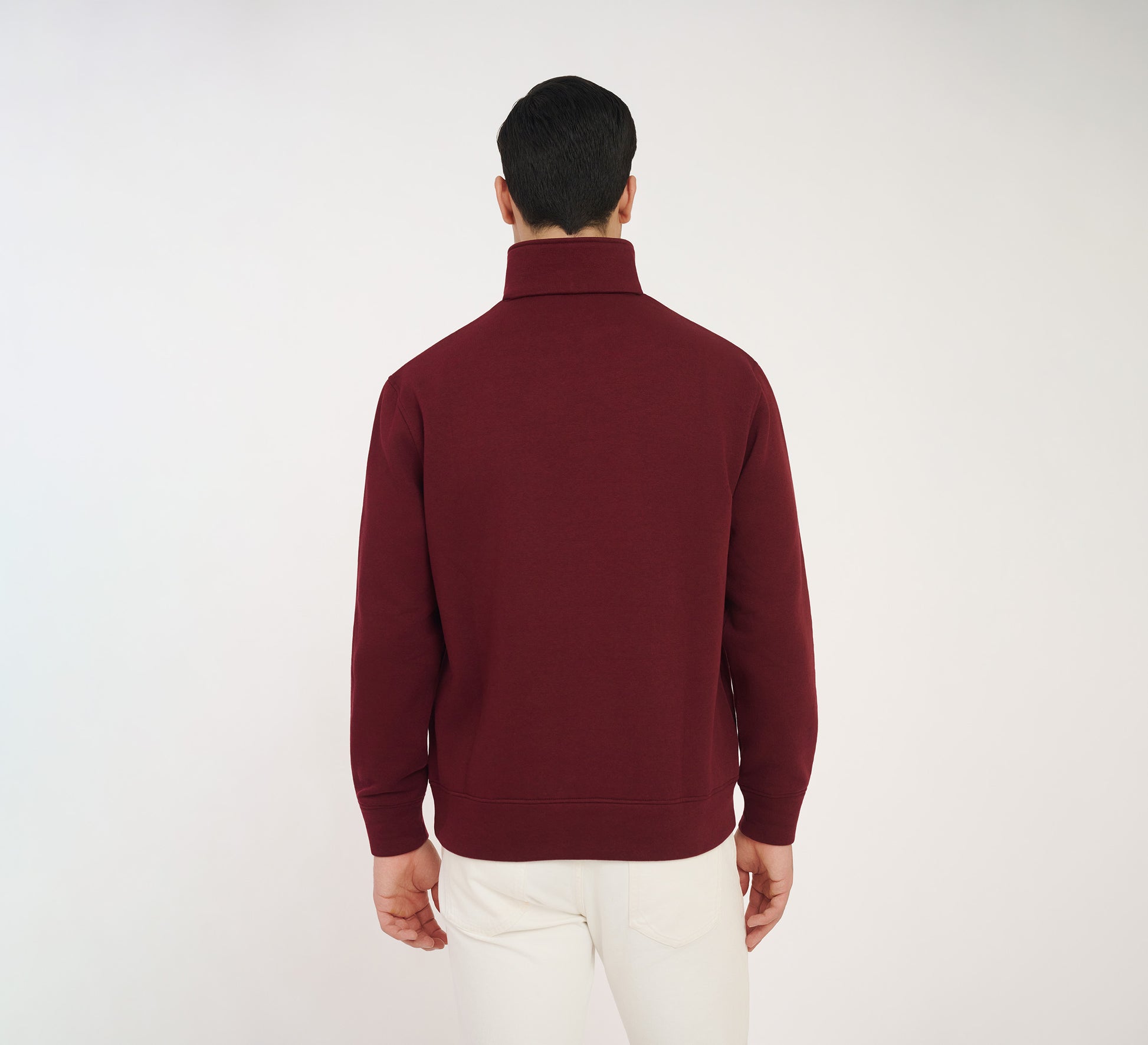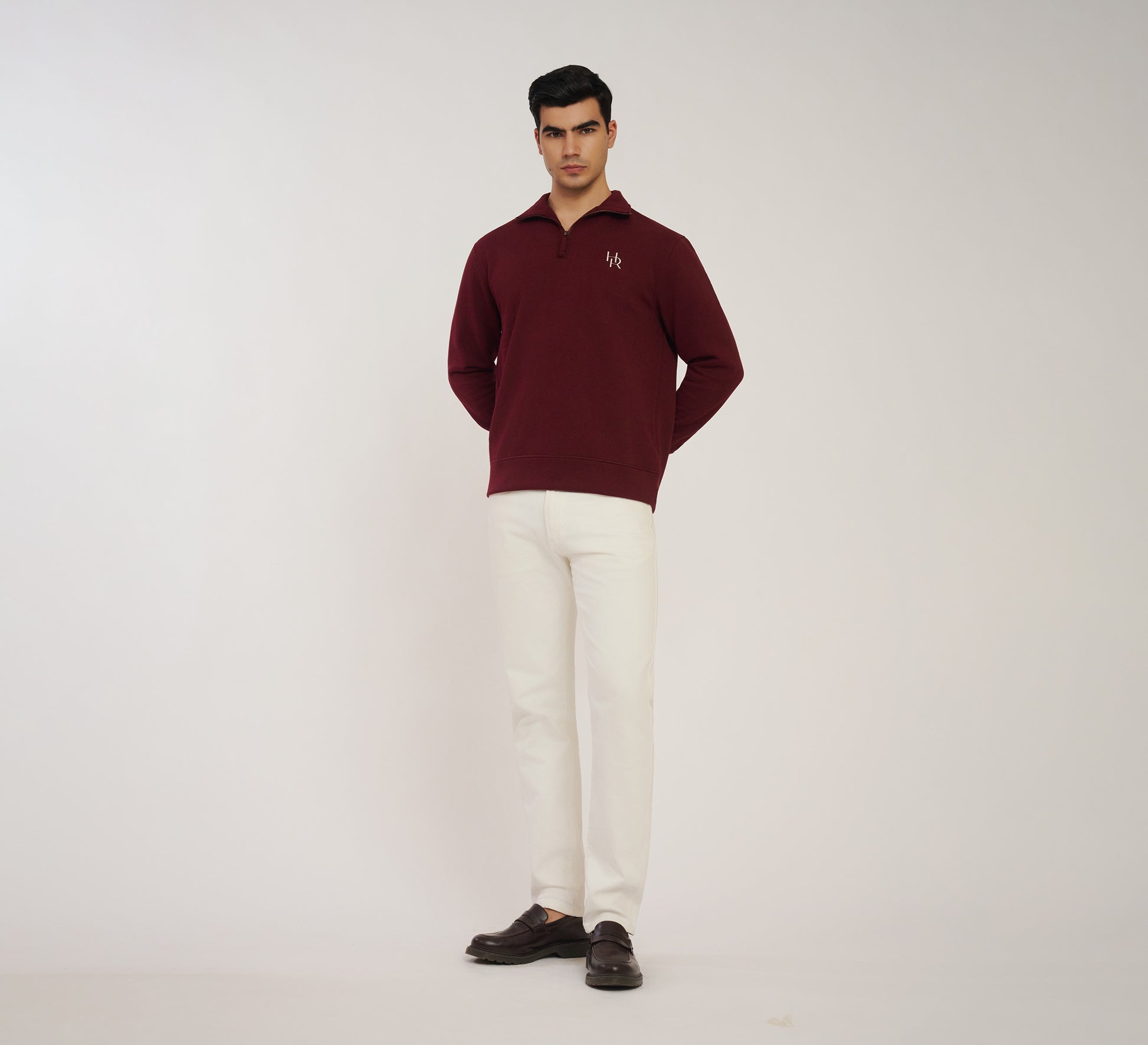 A maroon quarter zipper designed in a regular fit, crafted from a soft, breathable knit that offers comfort and ease of movement. The design provides a flattering structure while maintaining warmth and versatility for layering. Features an embroidered Harv and Rose Icon on the left for a refined touch.