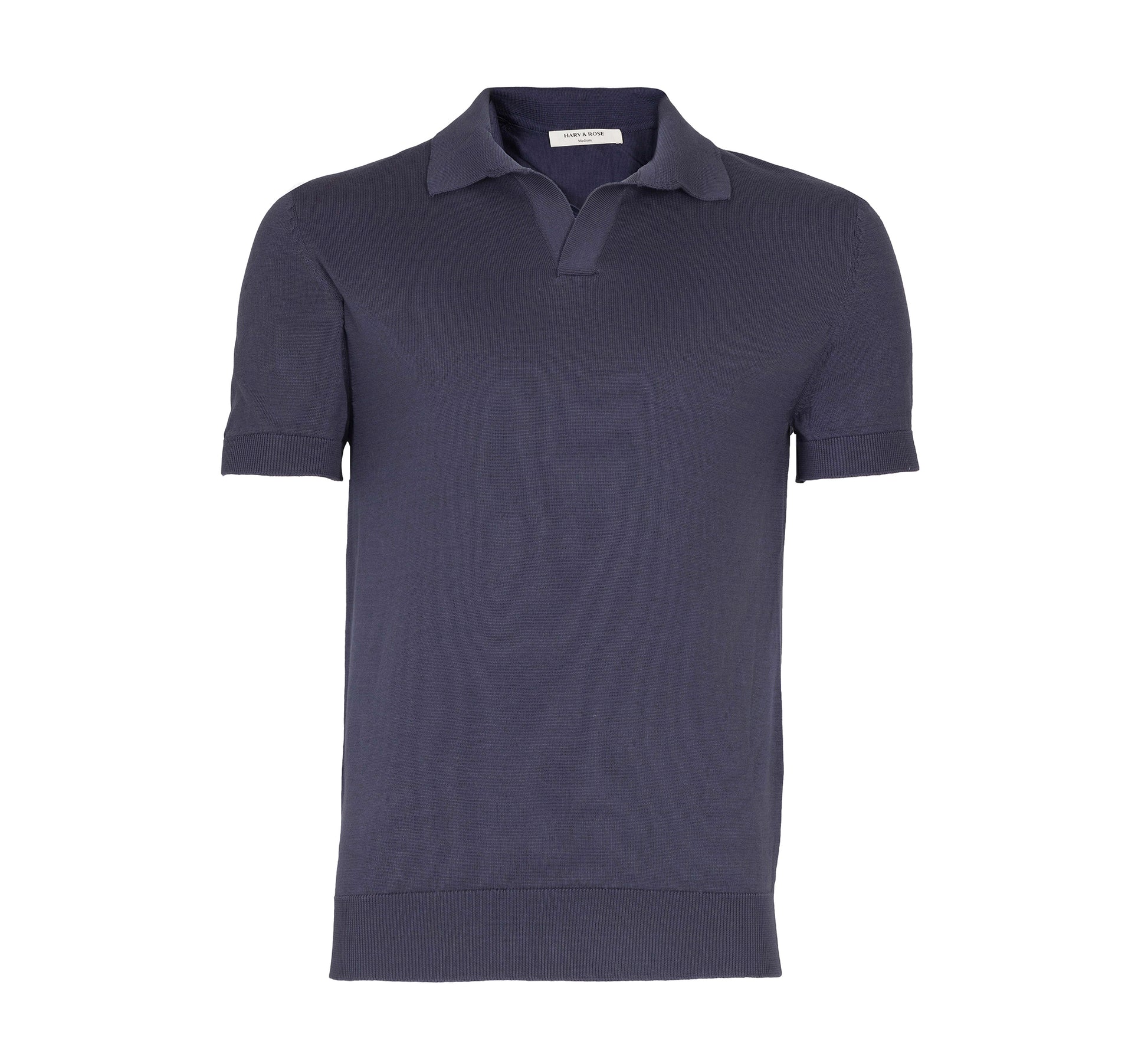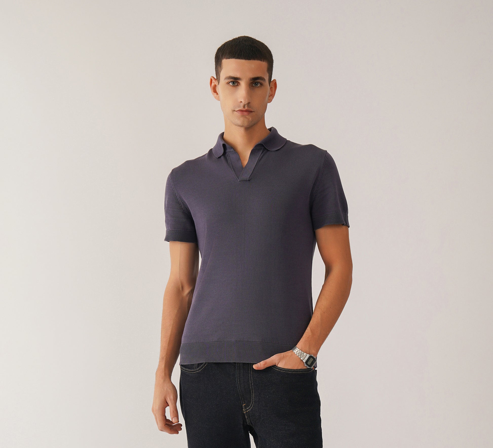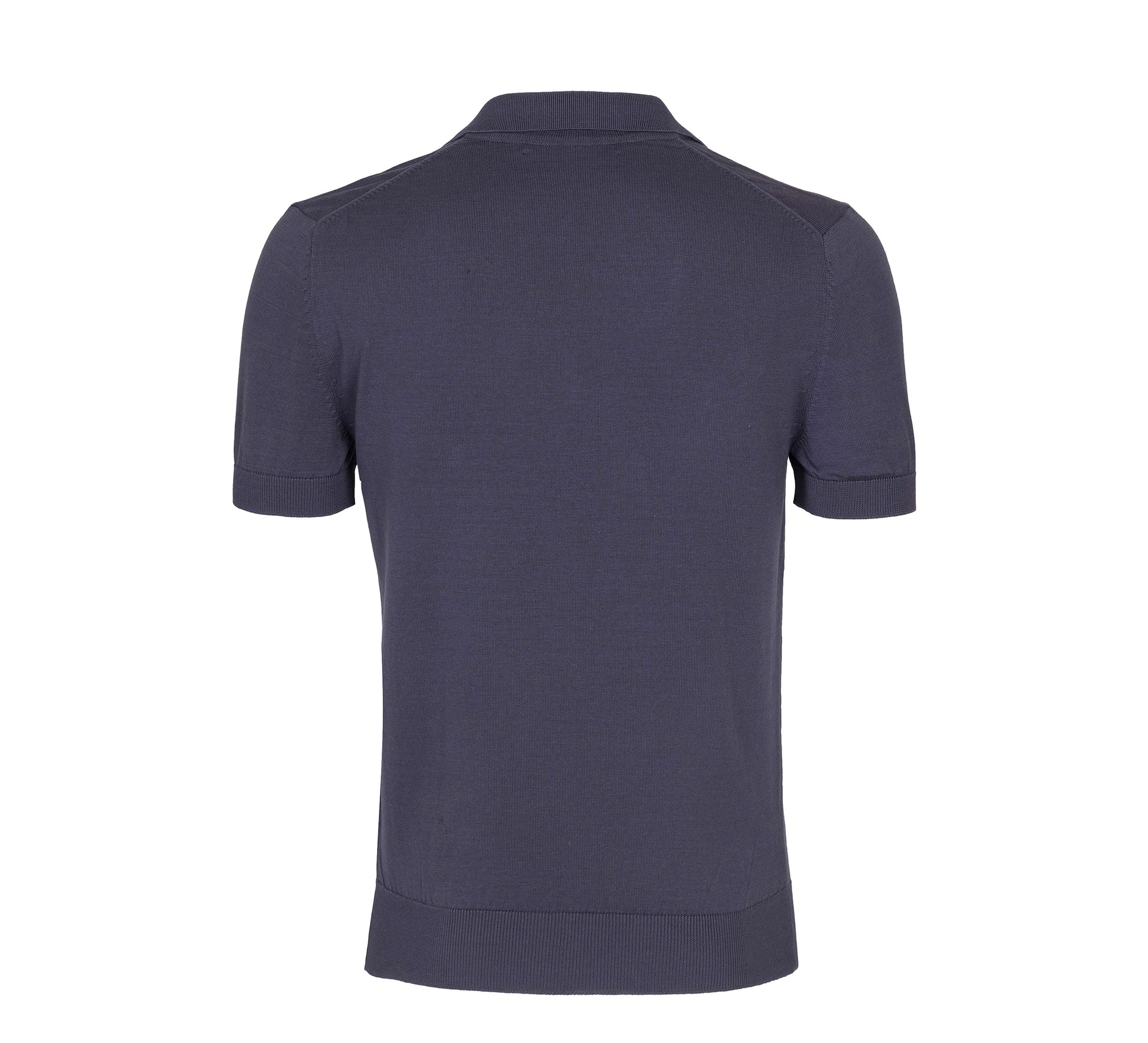 A slim-fit buttonless purple knit polo crafted from 100% Mercerised Egyptian Cotton, offering a silky-smooth finish, exceptional softness, and a refined drape. Designed for a sleek, modern silhouette with effortless comfort.